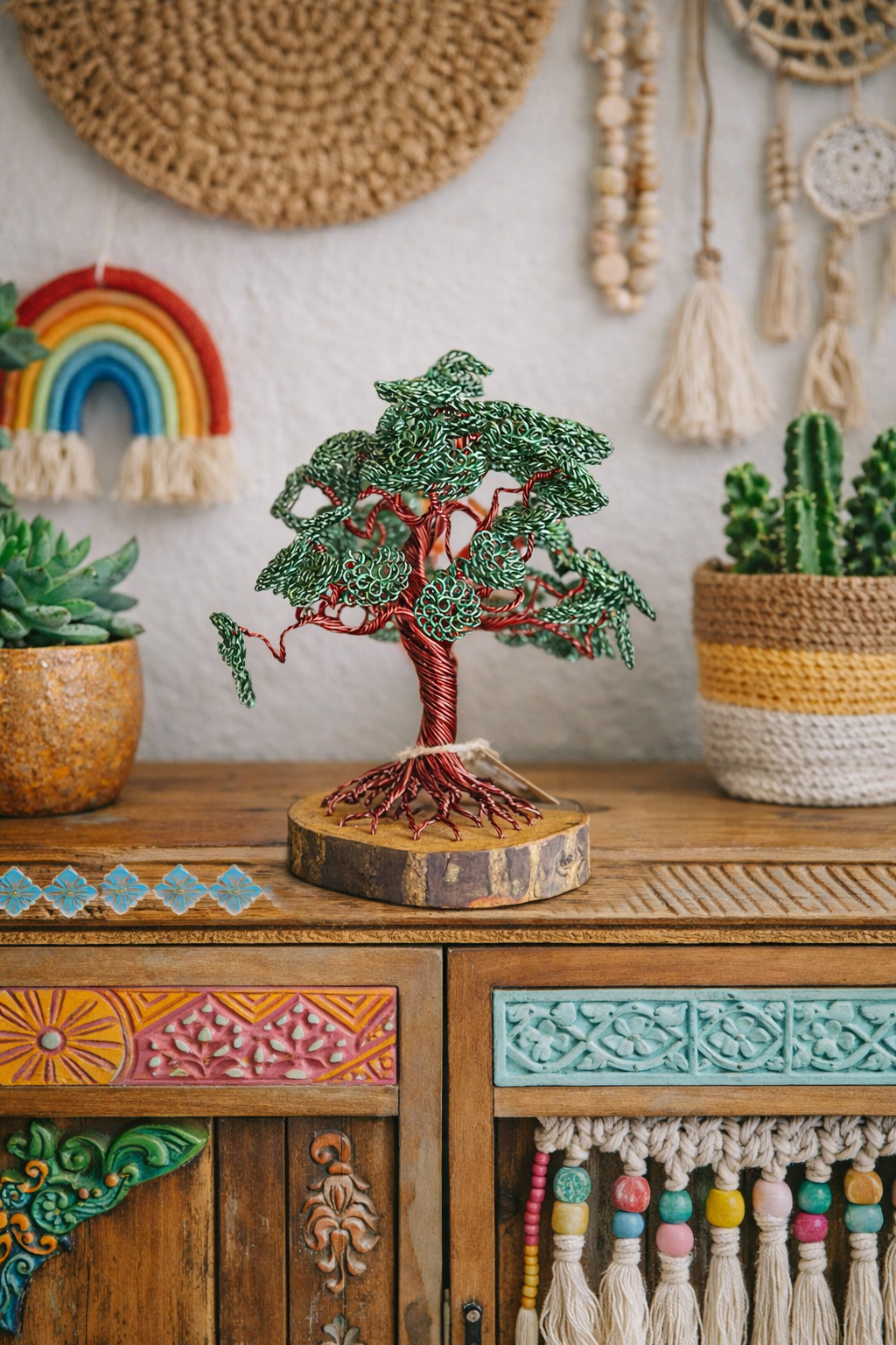 Essa árvore artesanal, moldada em fios e cheia de detalhes, representa crescimento, força e conexão. Cada curva é feita à mão, transformando um simples material em uma peça que chama atenção e traz vida para qualquer ambiente.