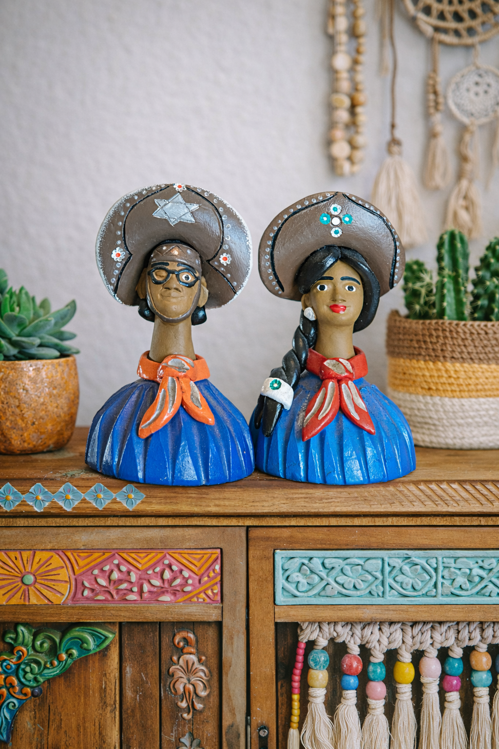 Esse par de bustos do artesão Luiz Galdino retrata com delicadeza e personalidade figuras típicas do Nordeste, com seus chapéus marcantes, cores vivas e expressões cheias de história. Cada detalhe — do lenço ao olhar — carrega a essência da cultura popular e das raízes sertanejas.