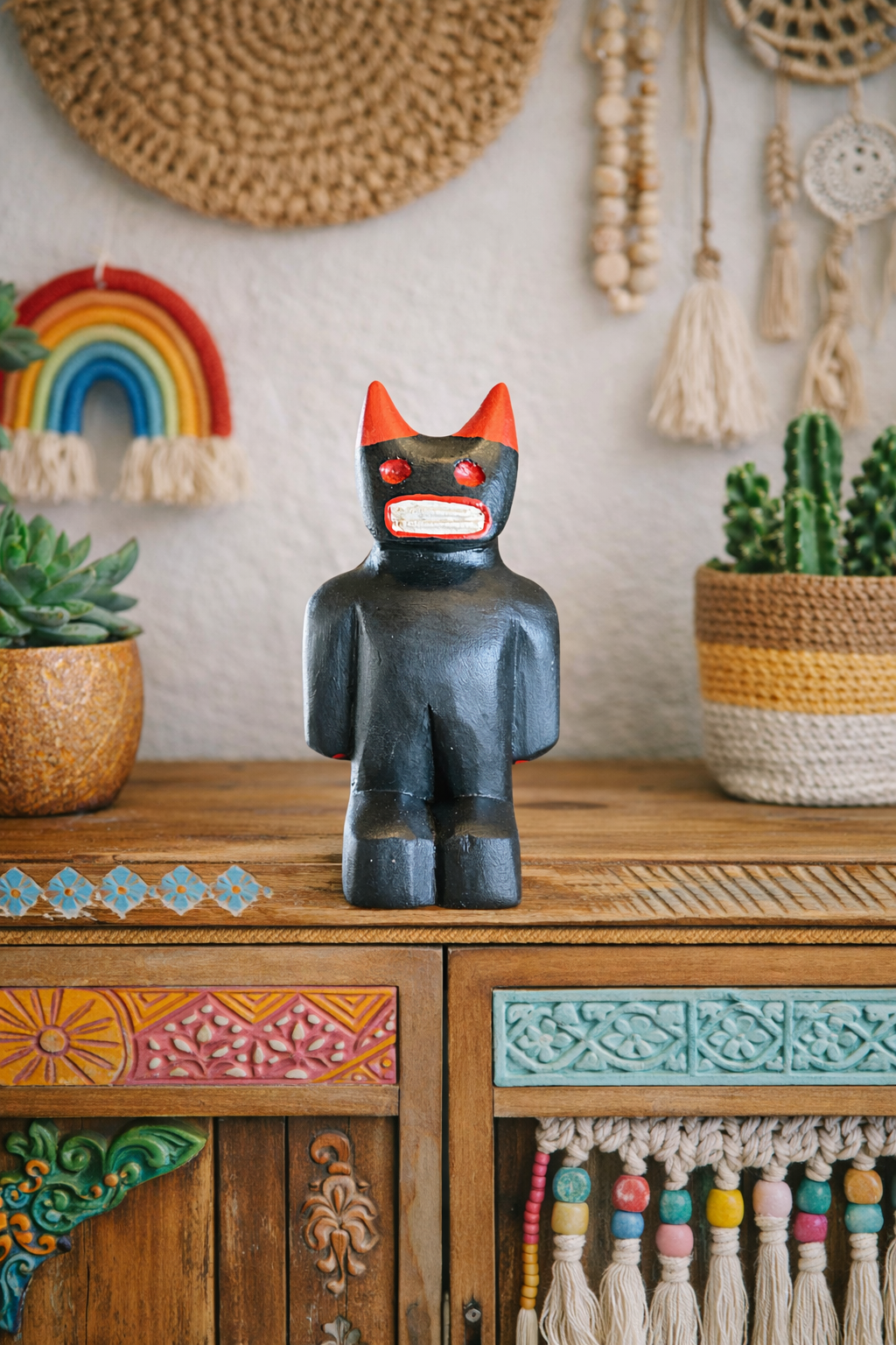 Direto de Juazeiro do Norte, essa peça única é esculpida à mão pela artesã Mara e inspirada no Cão do Reisado, personagem marcante do folclore nordestino.