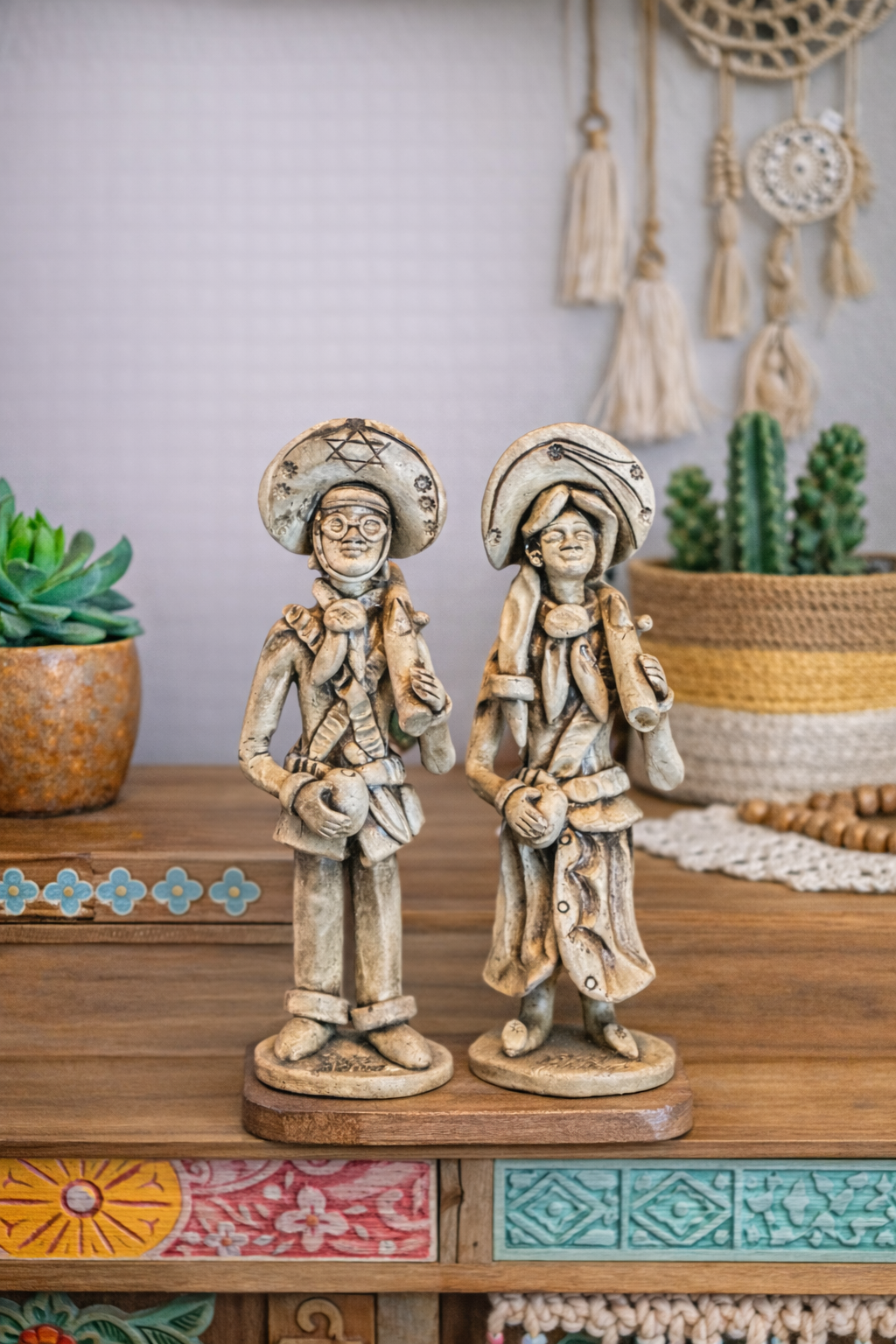 Esse par de bustos do artesão Luiz Galdino retrata com delicadeza e personalidade figuras típicas do Nordeste, com seus chapéus marcantes, cores vivas e expressões cheias de história. Cada detalhe — do lenço ao olhar — carrega a essência da cultura popular e das raízes sertanejas.