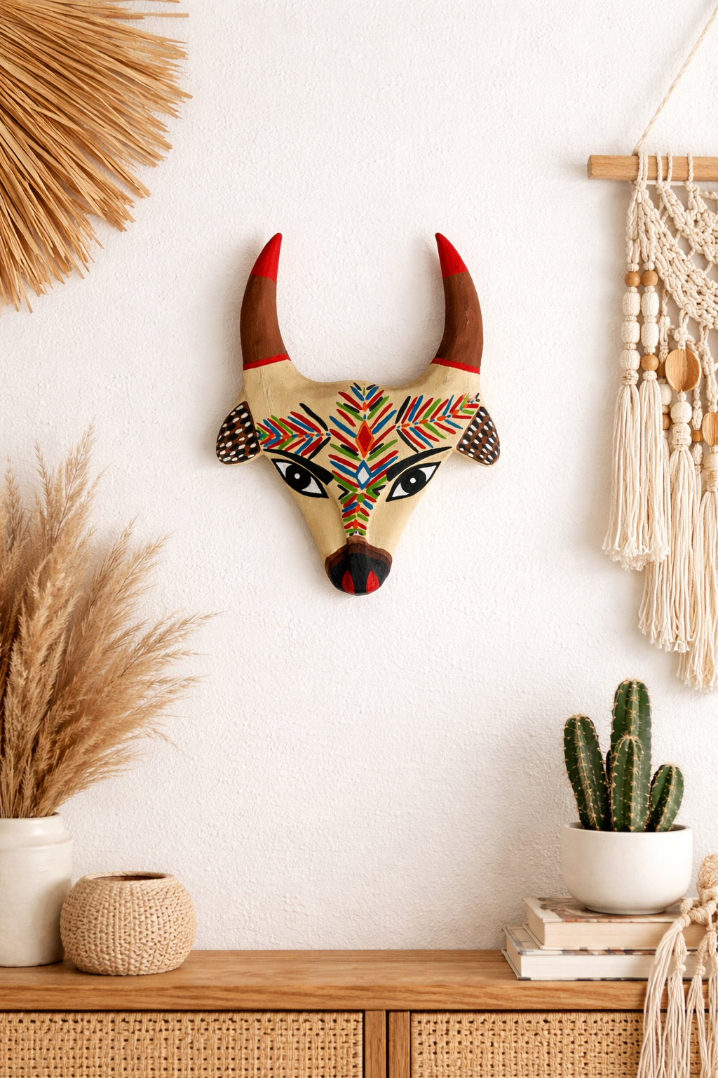 A máscara de boi do mestre Mestre Zé Crente é uma peça que carrega força, tradição e identidade em cada traço. Feita à mão em madeira, ela traz pintura vibrante e detalhes únicos que transformam qualquer parede em um ponto de destaque cheio de história.